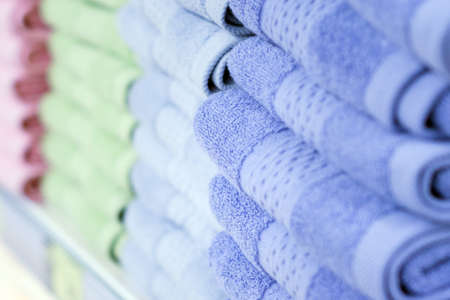 Stack of colorful terry towels folded. Shop Home. Numerous towels stacked and folded on the shelves of a store