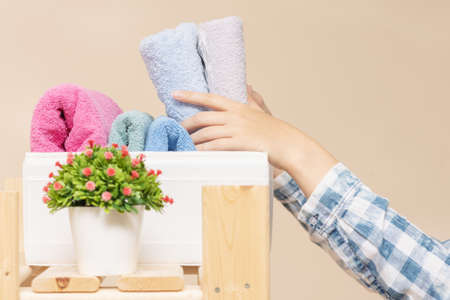 Towels folded in a wicker box stand on shelf in the closet close-up.