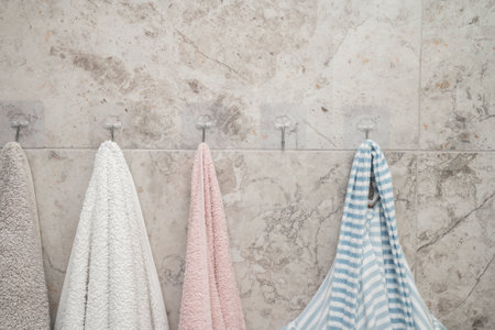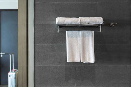 Modern spa and bathroom interior concept, relaxing decor. Clean white towels. Soft selective focus.