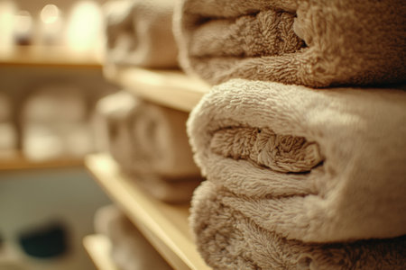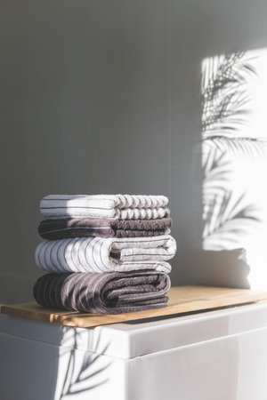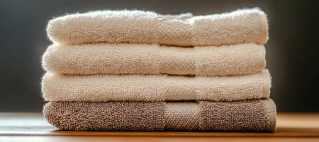 Inviting Soft Cotton Bath Essentials Stacked on Brown Table, Creating a Calm Spa Home Comfort Vibe