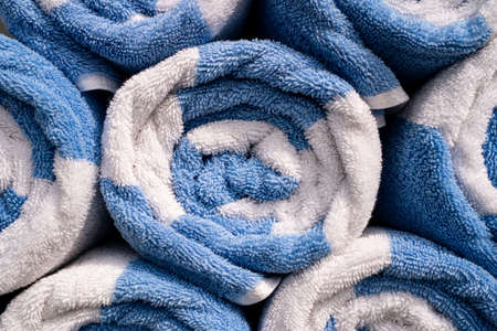 Bath towel rolls fabric texture cloth background in blue color for swimming pool, sea beach, gym fitness in resort hotel