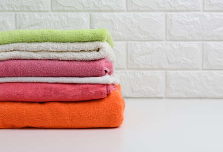Colorful towels stacked neatly on a clean surface, showcasing various vibrant hues and textures, creating an inviting and fresh appearance, ideal for home or hospitality settings