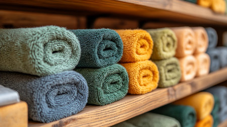 Neatly organized stacks of colorful plush bath towels in various shades displayed on wooden shelves in a retail setting, showcasing comfort and quality.