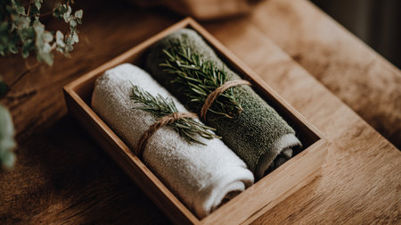 , slightly overhead shot focusing on two small, plush hand towels, one white and one muted green, both rolled tightly and secured with natural twine that incorporates a sprig of fragrant herb, likely rosemary. The towels are nestled within a simple, light brown wooden box placed upon a richly textured, warm wooden table surface, with soft focus on surrounding greenery in the background to enhance the spa or wellness atmosphere.