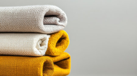 Neatly stacked fabric rolls in yellow and cream shades on textured background for home decor