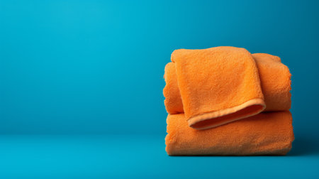 a flat layout photo featuring 4 orange towels stacked on a vibrant blue background. this uhd image showcases a shallow depth of field and bold saturation, capturing the attention of viewers. the composition highlights the innovative design of the towels, which are made from raw materials. softbox lighting enhances the clean and streamlined aesthetic of the image. ai generated