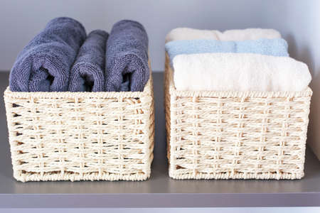 Laundry, towels folded and rolled in baskets in bedroom. Concept of tidiness, minimalism lifestyle and japanese folding system. Organizing wardrobe, stuff in boxes
