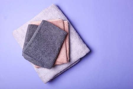 Clean towels gray, orange, lilac, white on a pink background. Place for text.