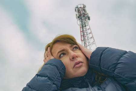 The woman is holding her head near the BTS. Harmful radiation from cellular 5G network transmitters concept