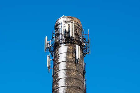 Wireless Communication Antenna Transmitter. Telecommunication tower with antennas on blue sky background.