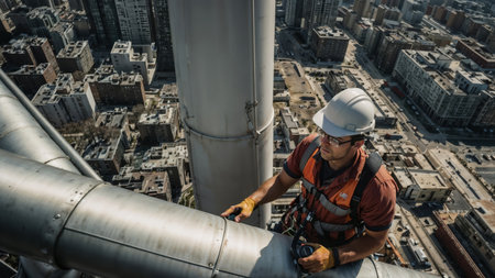 panoramic view of skyscrapers with scaffolding and construction workers visible, created with generative ai