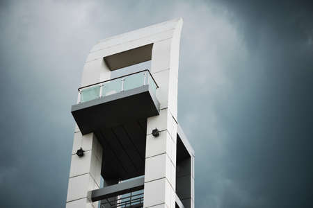 Low angle view of modern skyscraper against cloudy sky. Business concept