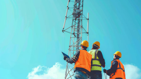 A group of engineers inspecting a telephone signal tower with safety gear and equipment