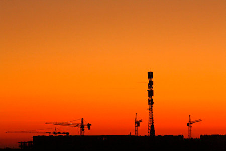 Construction tower cranes at sunset. Silhouette of the cranes on a nice orange and blue background with the last rays of sun in Madrid, Spain.