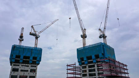 construction tower cranes are building new apartment buildings in a residential area of the metropolis