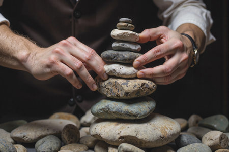 Carefully stacking rocks creating a balanced cairn on a beach at sunset, symbolizing harmony, mindfulness, and peace