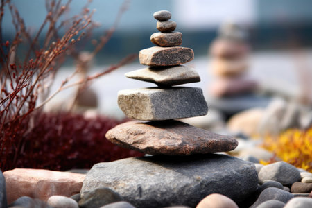 close-up of balanced stone tower in a zen garden, created with generative ai
