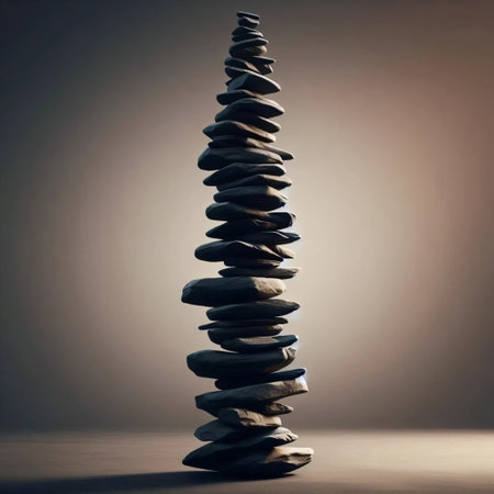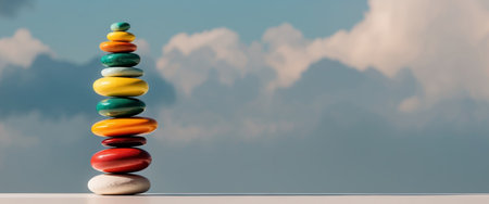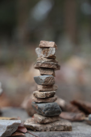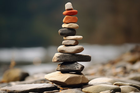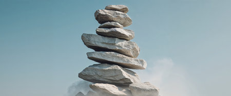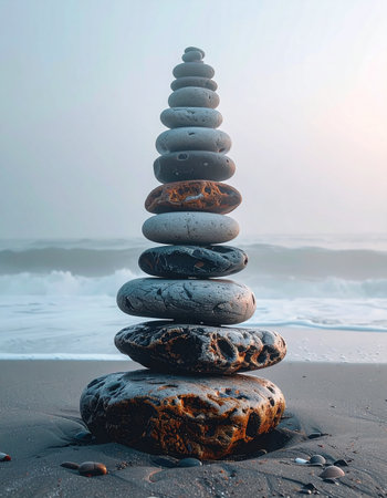 A carefully balanced stack of zen stones stands as a symbol of stability and mindfulness on a rocky cliff.
