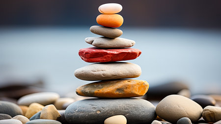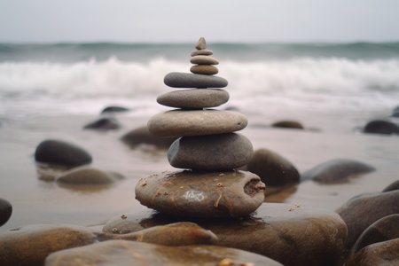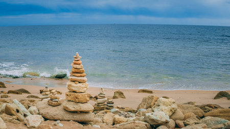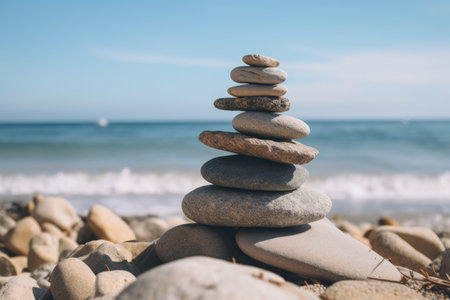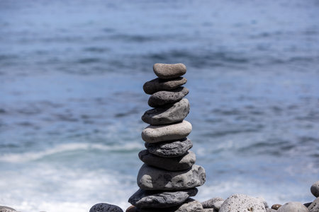 Pebble tower balance harmony stones arrangement on sea beach coastline peaceful formation pyramid