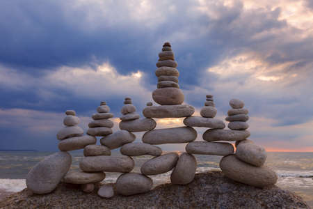folded pyramid Zen pebble stones on the sea beach at sunset