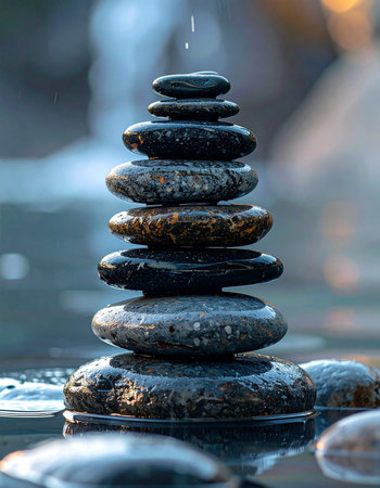 A single drop of water falls with perfect timing onto a carefully balanced tower of smooth stones.