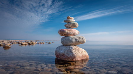 Generative AI : concept of balance and harmony rocks on the coast of the Sea in the nature