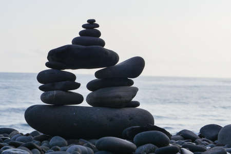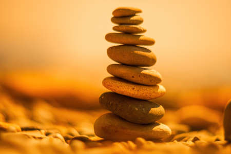 Stone balance on the beach at sunset. Pyramid of the small pebbles on the beach. Stones, against the background of the sea shore during sunset.