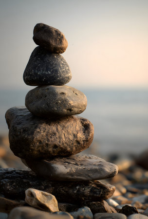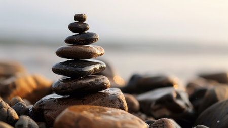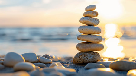 A calming stack of zen stones balanced perfectly against a vibrant sunset backdrop on a pebbled beach, evoking peace and harmony.