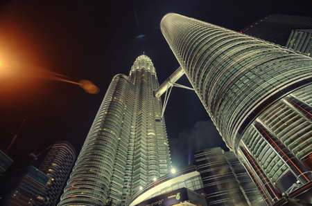 bottom-up View to twin towers in the night time featuring nice lens flare
