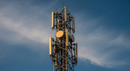 A 5G mobile internet communication tower transmits wireless signals under a bright sky, showcasing modern telecommunication technology.