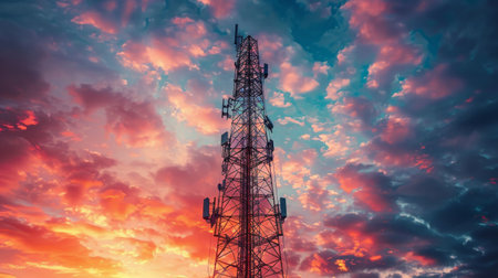 A striking telecommunication tower stands tall against a vibrant sunset sky filled with colorful clouds, showcasing modern technology and connectivity.