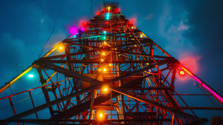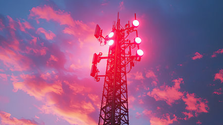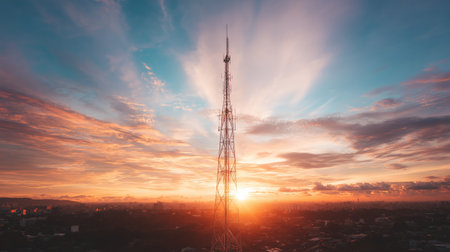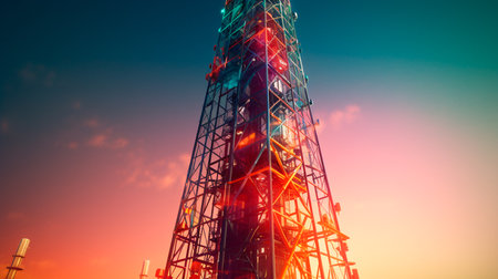 A cell phone tower stands tall against a colorful sky, creating a striking contrast of man-made structure and natural beauty, Abstract telecommunication tower on a plain background, AI Generated