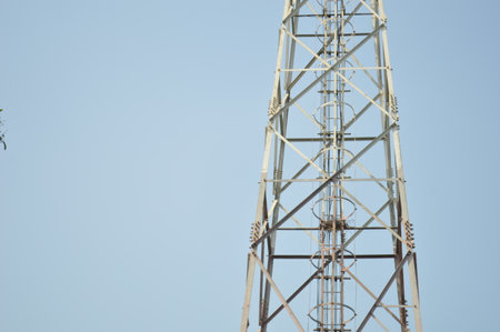 A tall communication tower rises against a clear blue sky, showcasing telecommunications technology. The structure supports antennas for signal transmission.