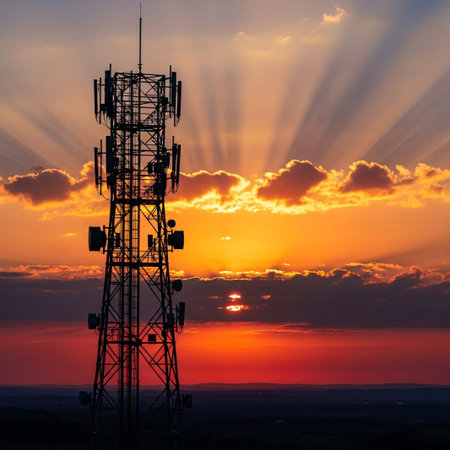 A telecommunication tower's silhouette stands tall against a stunning sunset sky, radiating with orange and red hues. Dramatic sunbeams emphasize global connectivity.