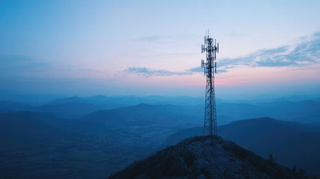 A cell phone tower at the top of a tall mountain, surrounded by a panoramic view of nature, representing expansive rural and mountainous coverage.