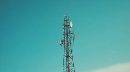 Cellular communication tower with multiple antennas against a clear blue sky, representing modern wireless technology and global connectivity infrastructure.