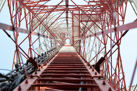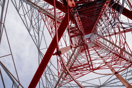 Low-angle view of a red and white telecommunications tower structure against a bright sky, highlighting modern engineering, symmetry, and industrial design.