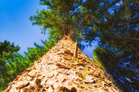 Moody pine tree trunk, bottom view, creative angle
