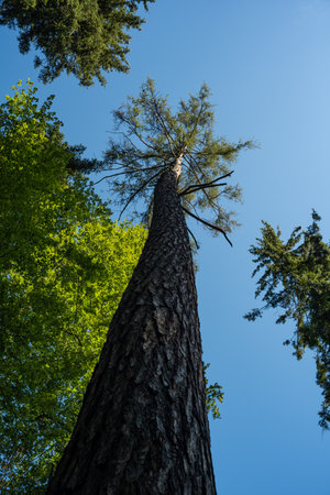 Tall pine tree trunk and branches in a forest in Europe. Sunny summer day, blue sky, low angle looking up, no people.