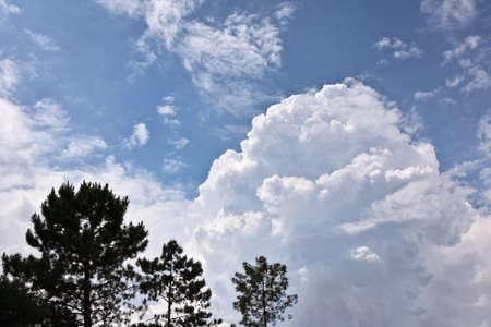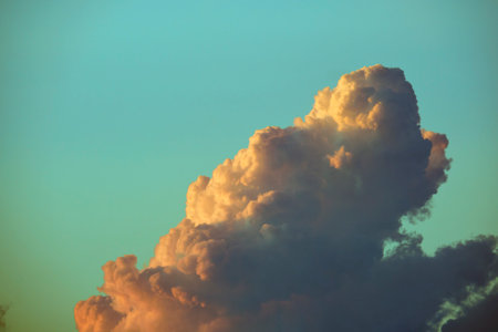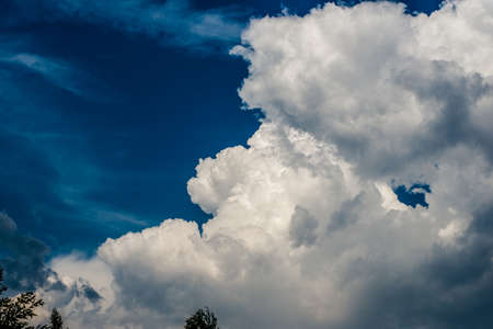 White fluffy cumulonimbus clouds forming before thunderstorm on evening sky. Changing stormy cloudscape weather at sunset