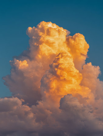 Vibrant, luminous clouds stretch upward, illuminated by the setting sun?s golden hue, contrasting beautifully with the crisp blue sky for a breathtaking view.