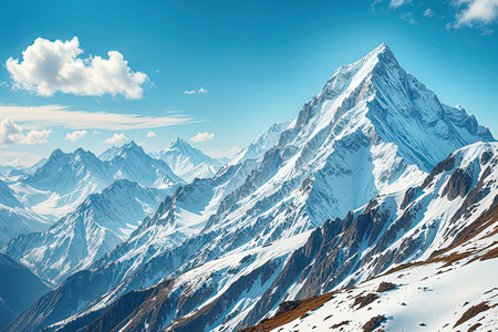 snow-covered mountain peaks with blue sky above, created with generative ai