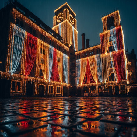 The main building of the town hall decorated with garland at the Christmas market close-up. High quality photo