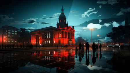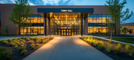 A modern town hall building featuring an illuminated entrance and landscaped walkway at dusk