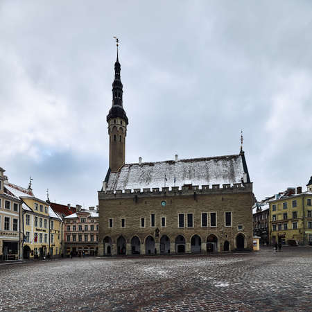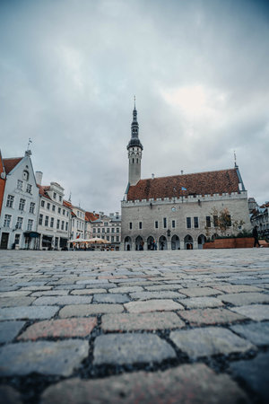 City hall and old town square on cloudy day in Tallinn, Estonia