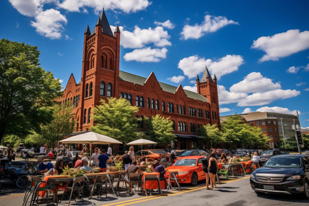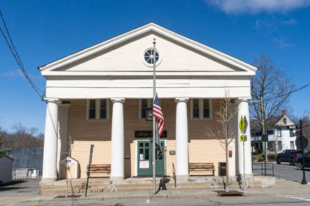 Sherborn town hall on Washington Street at the town center with fall foliage in Boston Metro West area, Massachusetts MA, USA.
