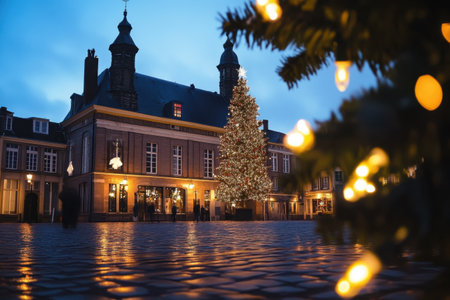 A beautifully lit Christmas tree decorates a charming marketplace creating a festive winter atmosphere during the evening hours.