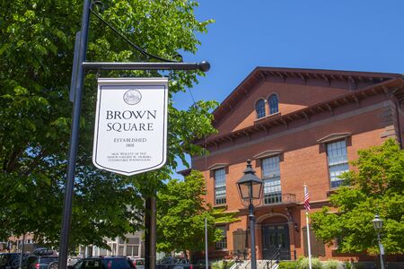 Historic buildings on Nason Street near Main Street in Maynard historic town center in summer, Maynard, Massachusetts MA, USA.
