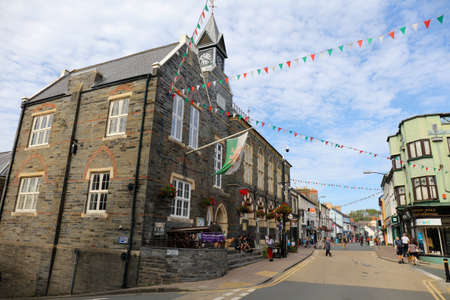 street view of the old town of Cardigan with the shire hall on the main street in a Sunday summer