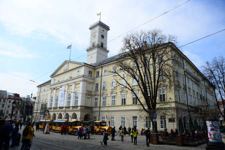 LVIV, UKRAINE - APRIL 17, 2019: Old Street lamps with Museum of Ethnography and Crafts on svobody avenue crossing between Akademika Hnatyuka. Svobody Avenue is the city main street.